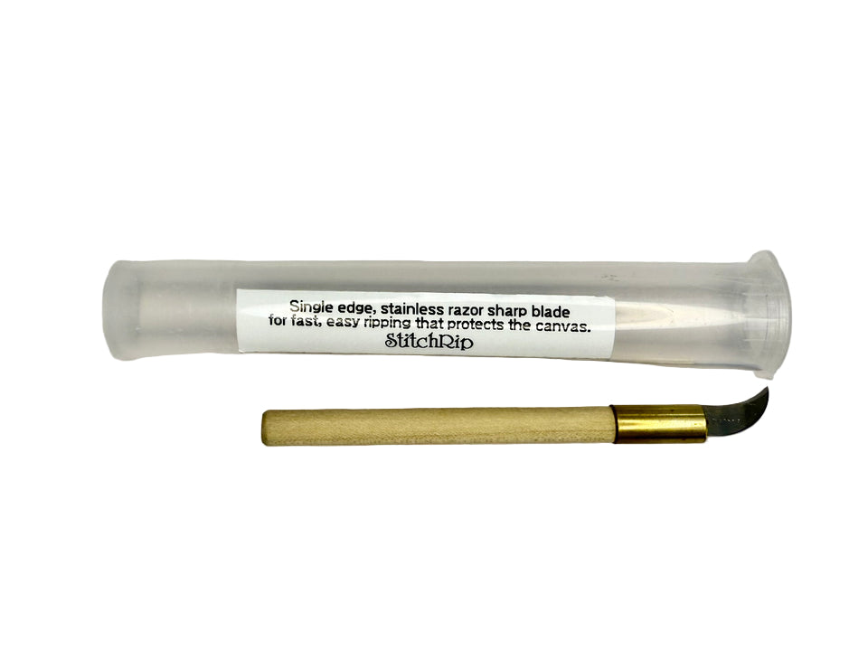 The perfect tool for ripping out stitching when needed. The curved blade is sharp on the inside while the outside edge is safe to put next to your canvas.